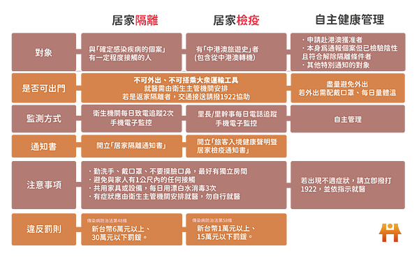 武漢肺炎(COVID-19)疫情延燒,這幾天在新聞報導、記者會中也常聽到「居家隔離」、「居家檢疫」、「自主健康管理」等名詞。它們針對的對象是誰?差在哪裡?又該如何進行呢?